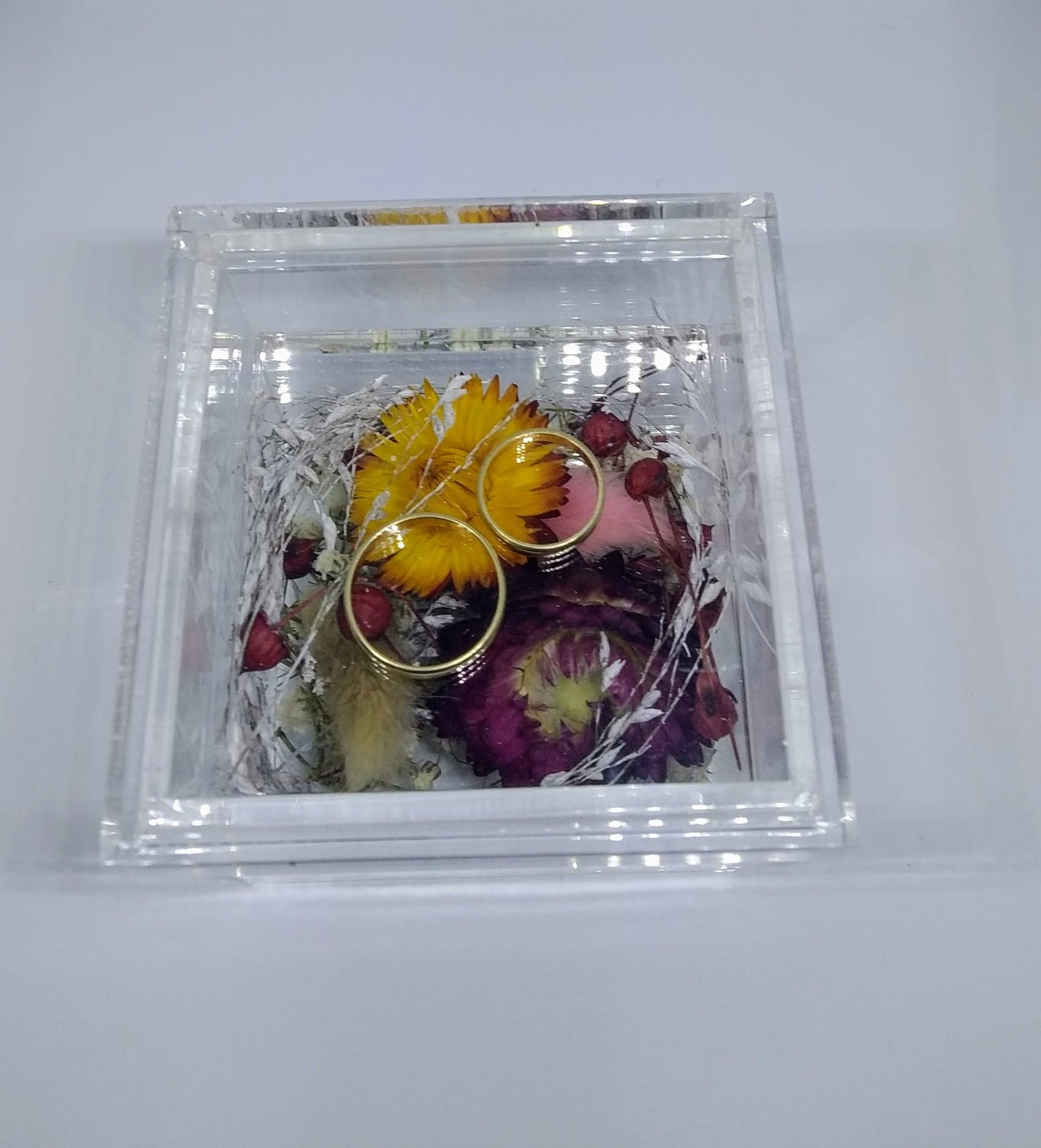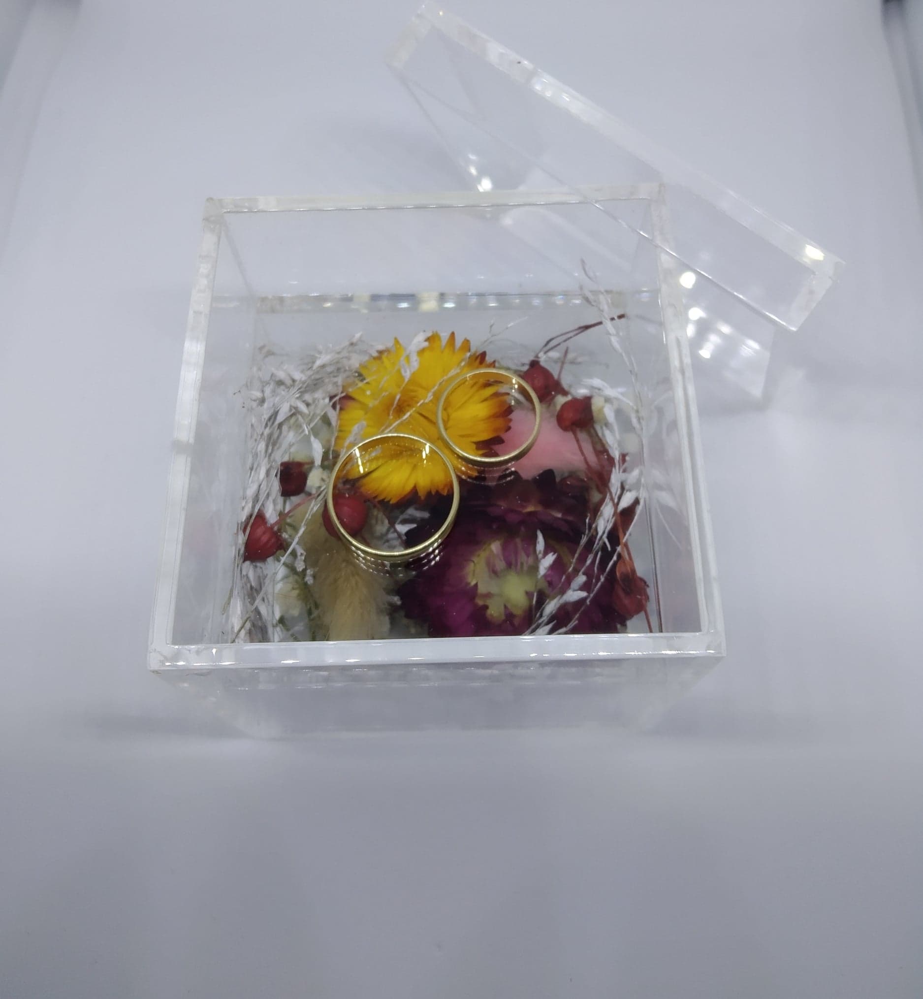 Pudełko na obrączki, transparentne, z podwójnym dnem, do którego można włożyć dodatki kolorystycznie pasujące do pozostałych dekoracji.