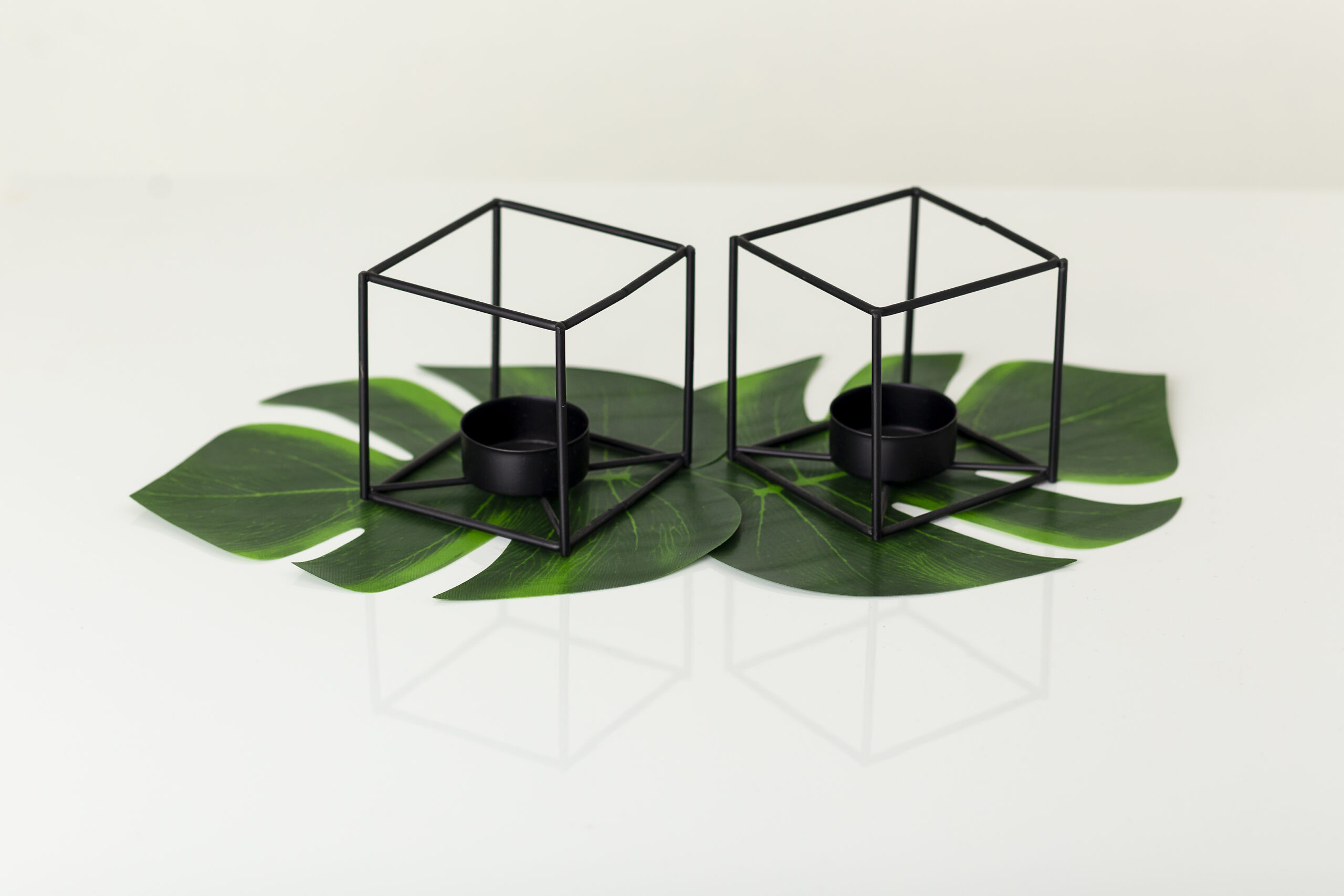Metalowe świeczniki geometryczne w kolorze czarnym.