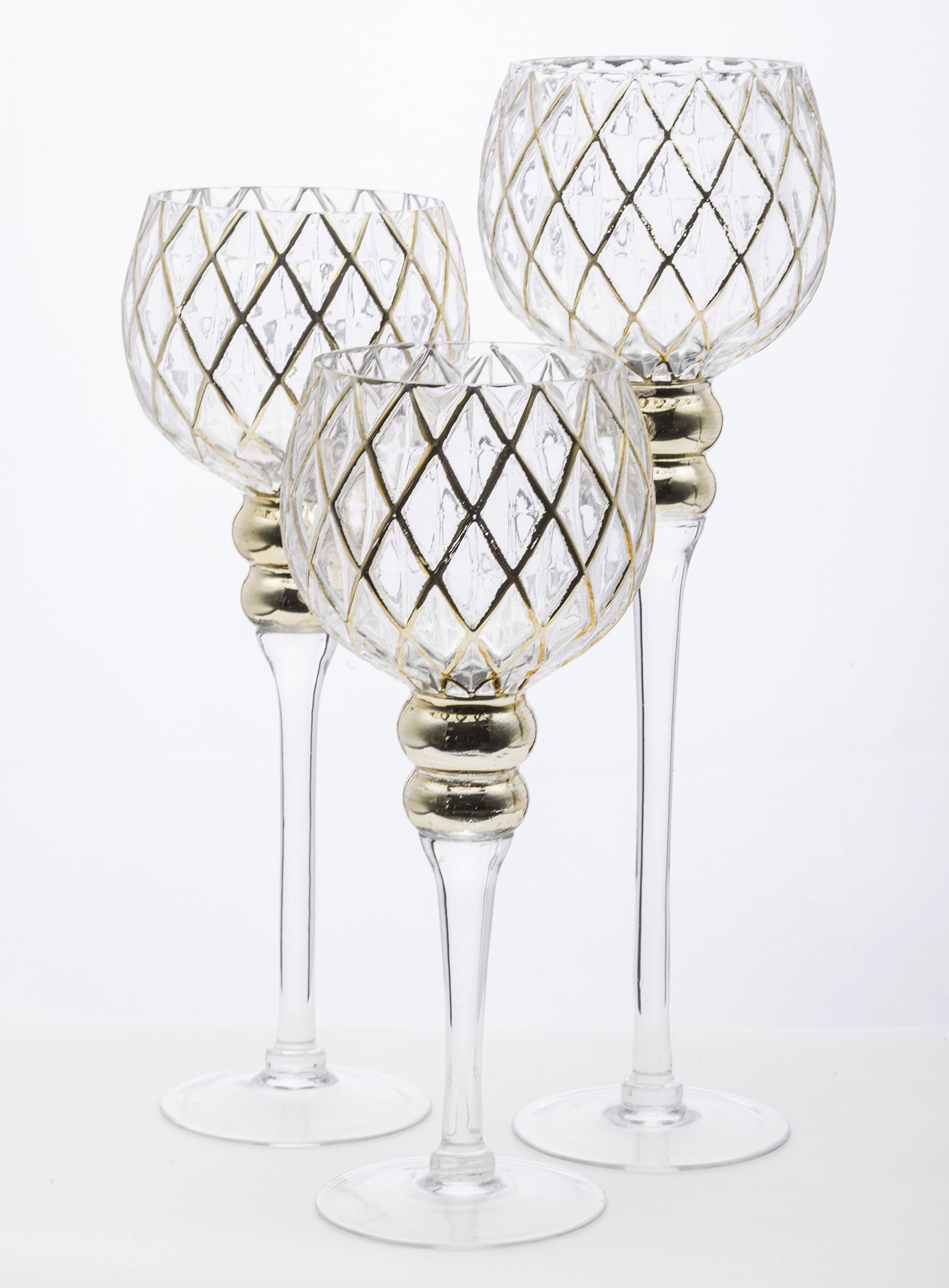 Szklane świeczniki ze złotymi zdobieniami na stopce.